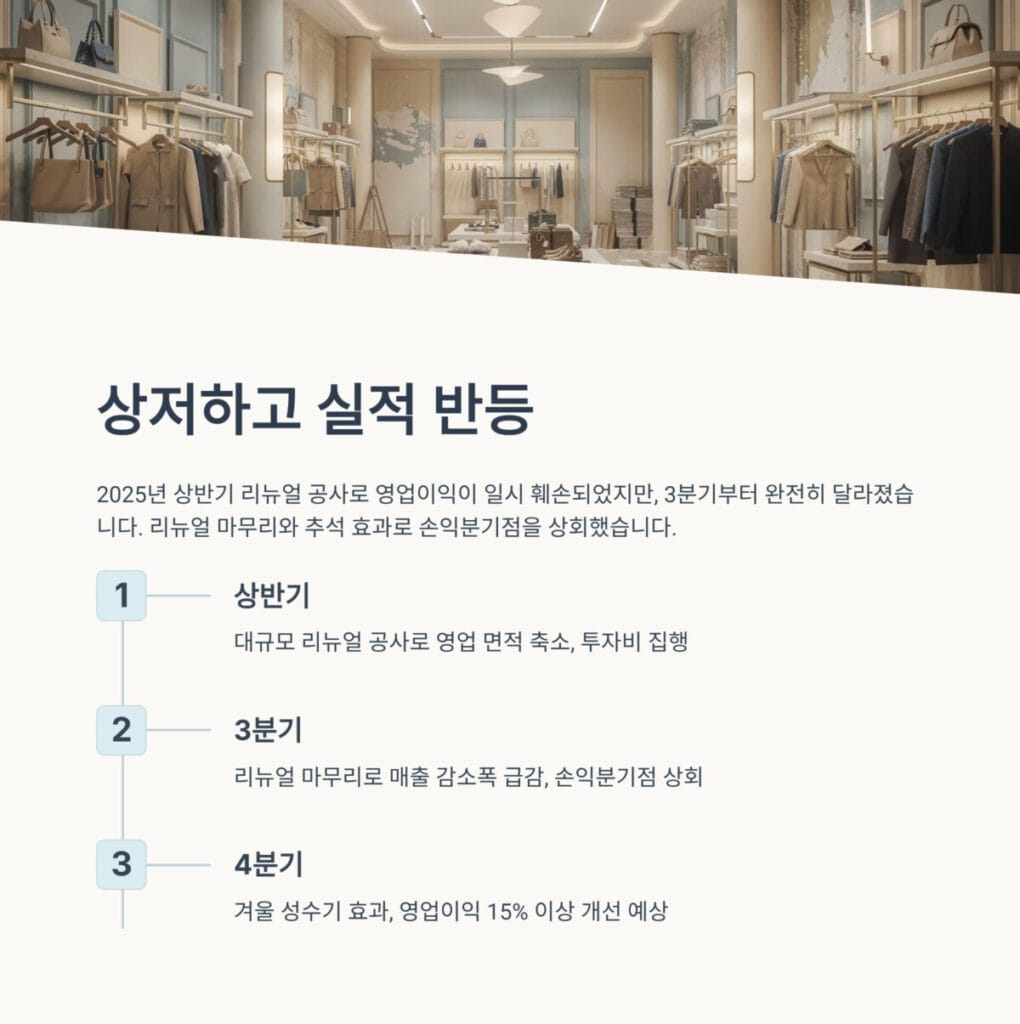 3분기부터 분위기가 완전히 달라졌습니다. 리뉴얼이 순차적으로 마무리되며 매출 감소폭이 급격히 줄어들었고, 추석 명절 효과까지 더해져 손익분기점을 상회하는 실적을 기록했습니다. 4분기는 더욱 기대됩니다. 백화점 최대 성수기인 겨울 시즌과 리뉴얼 그랜드 오픈 효과가 맞물리며 전년 동기 대비 15퍼센트 이상의 영업이익 개선이 예상되고 있습니다.