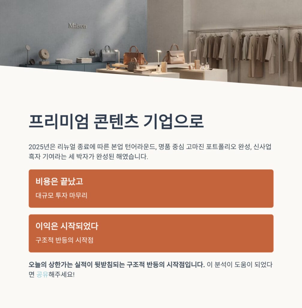 한화갤러리아 실적 분석을 정리하면, 2025년은 리뉴얼 종료에 따른 본업 턴어라운드, 명품 중심 고마진 포트폴리오 완성, 신사업 흑자 기여라는 세 박자가 완성된 해였습니다.