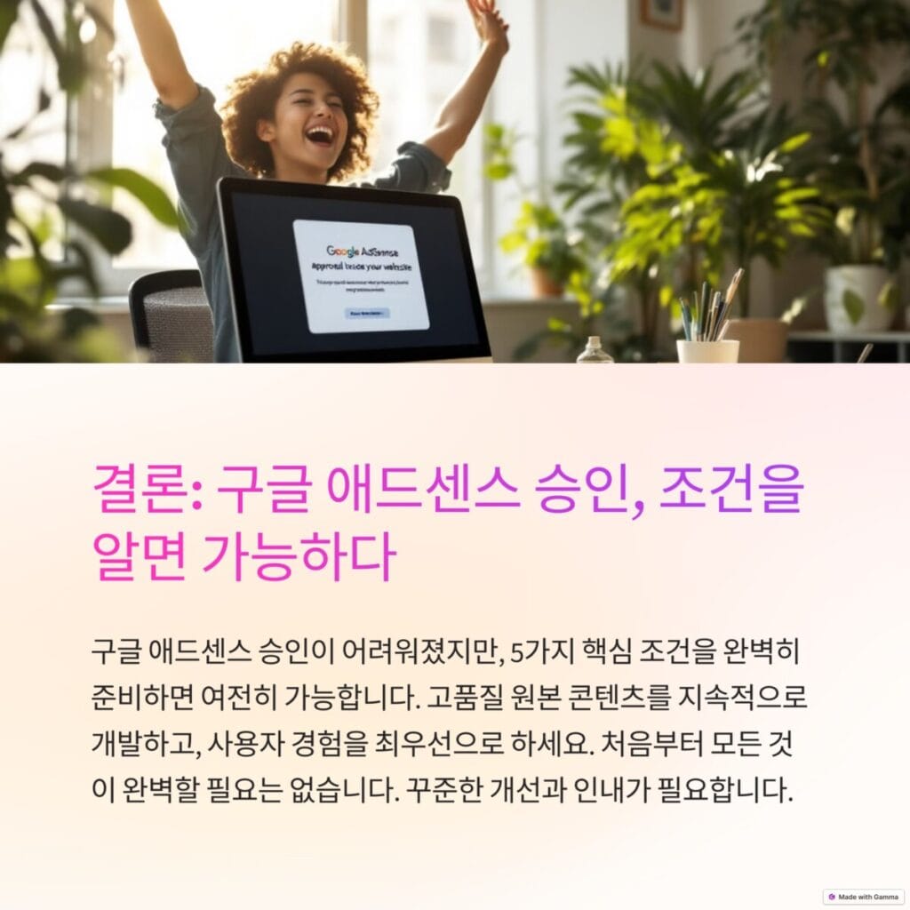 지금까지 2025년 1월부터 3월까지의 블로그 포스팅 30개를 분석하여 알아본 구글 애드센스 승인 조건에 대해 살펴보았습니다. 구글 애드센스 승인은 어렵게 느껴질 수 있지만, 이 글에서 설명한 5가지 핵심 조건을 충족한다면 충분히 승인 받을 수 있습니다.