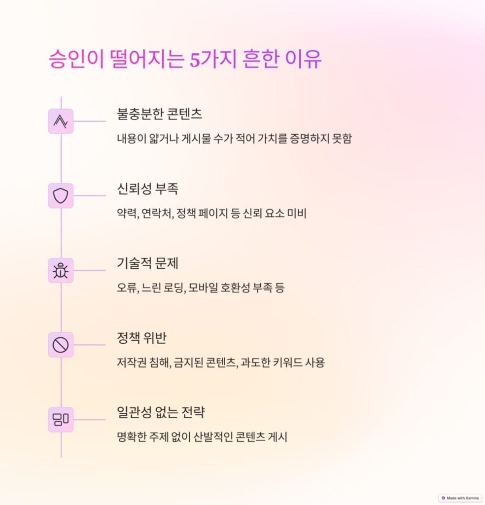 - 독창적인 콘텐츠: 다른 사이트의 내용을 복사하거나 리라이팅한 콘텐츠는 거절 사유가 됩니다.