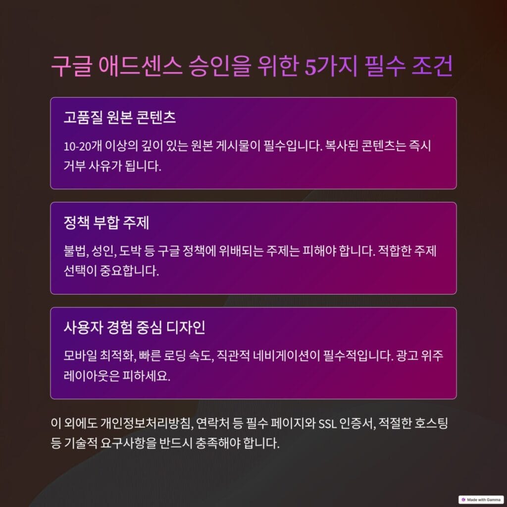 분석한 30개의 성공 사례에서 공통적으로 나타난 5가지 핵심 조건을 정리했습니다. 이 조건들은 2025년 현재 구글 애드센스 승인에 가장 중요한 요소들입니다.