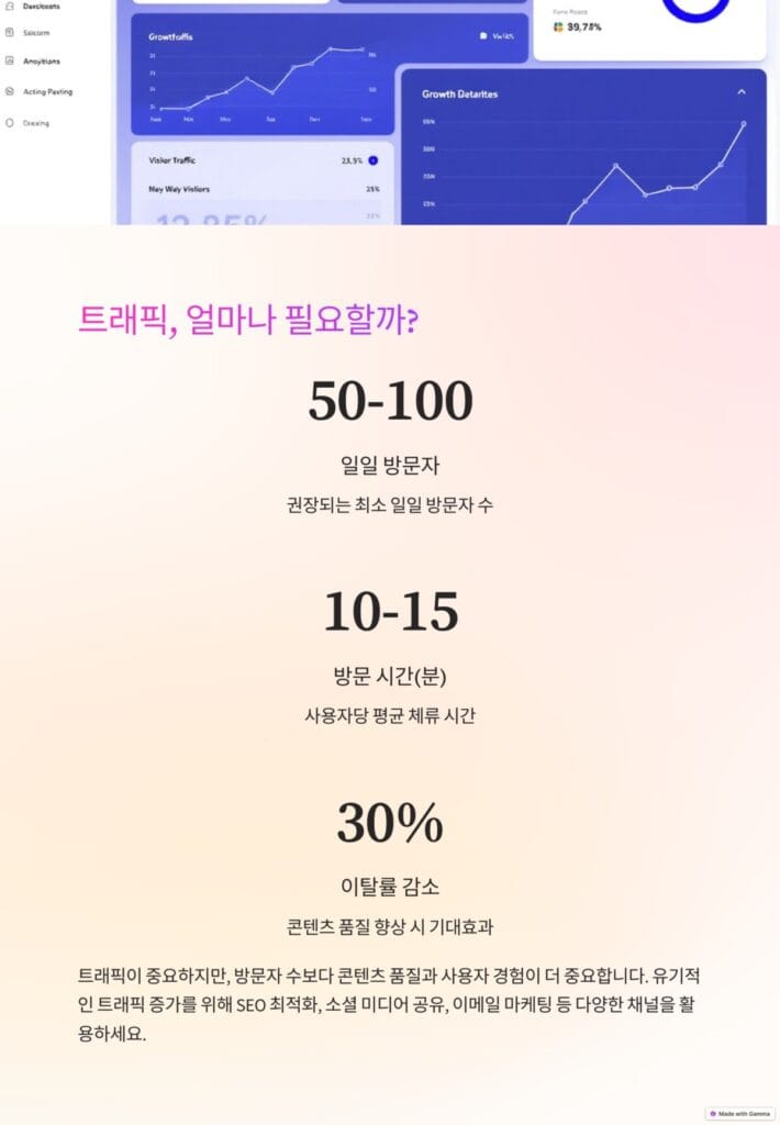 - 꾸준한 트래픽: 갑작스러운 트래픽 증가보다는 꾸준히 유지되는 트래픽이 더 중요합니다.