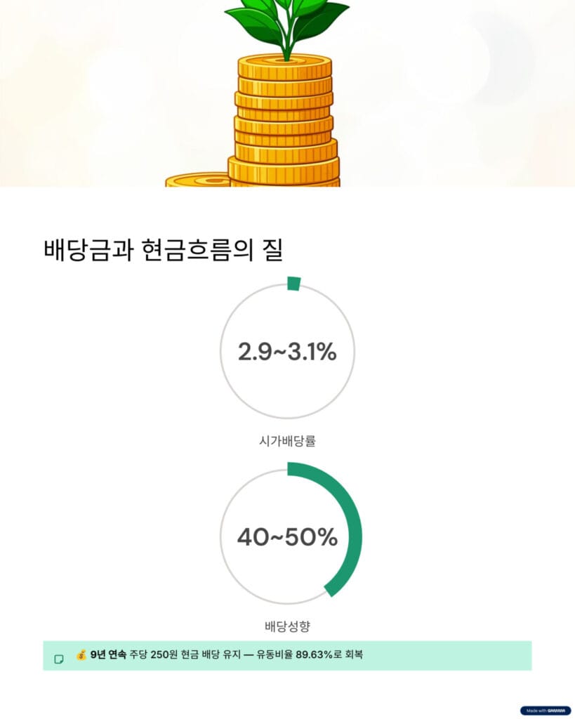 | 주당 배당금 | 250원 | 9년 연속 동일 금액 유지 |