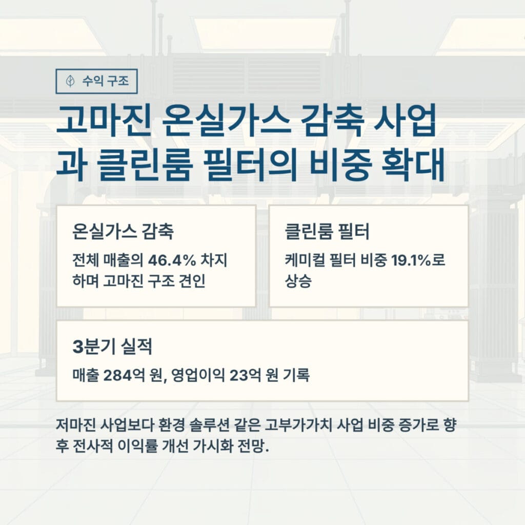 수익 구조의 질적 개선이 돋보입니다. 온실가스 감축 사업이 전체 매출의 46.4퍼센트를 차지하며 고마진 구조를 견인하고 있으며 클린룸 케미컬 필터 비중 역시 19.1퍼센트로 상승했습니다.