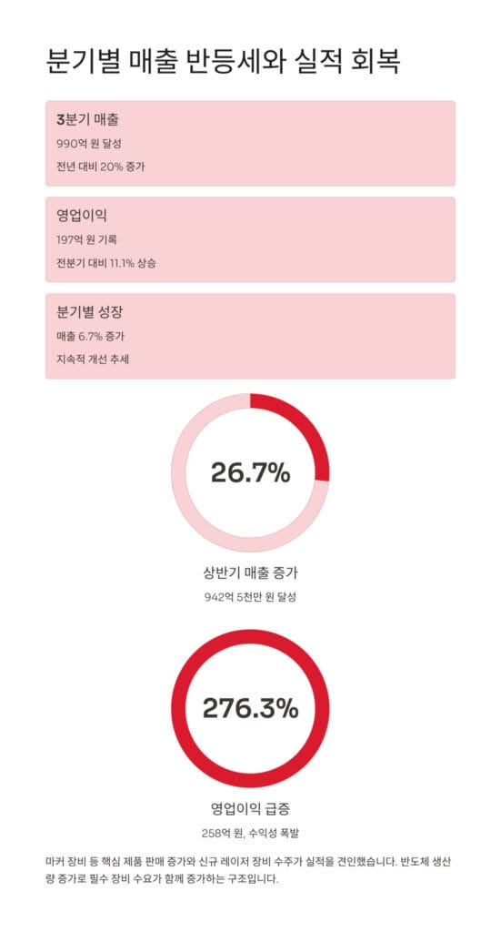 2025년 3분기 매출 990억 원 달성과 전년 대비 20% 성장은 반도체 경기 회복의 수혜를 직접 받고 있음을 입증합니다. 영업이익 197억 원과 전분기 대비 11.1% 증가는 지속적인 실적 개선 추세를 보여줍니다. 상반기 누적 실적이 매출 26.7%, 영업이익 276.3% 급증한 것은 수익성 중심의 질적 성장을 확인시킵니다.