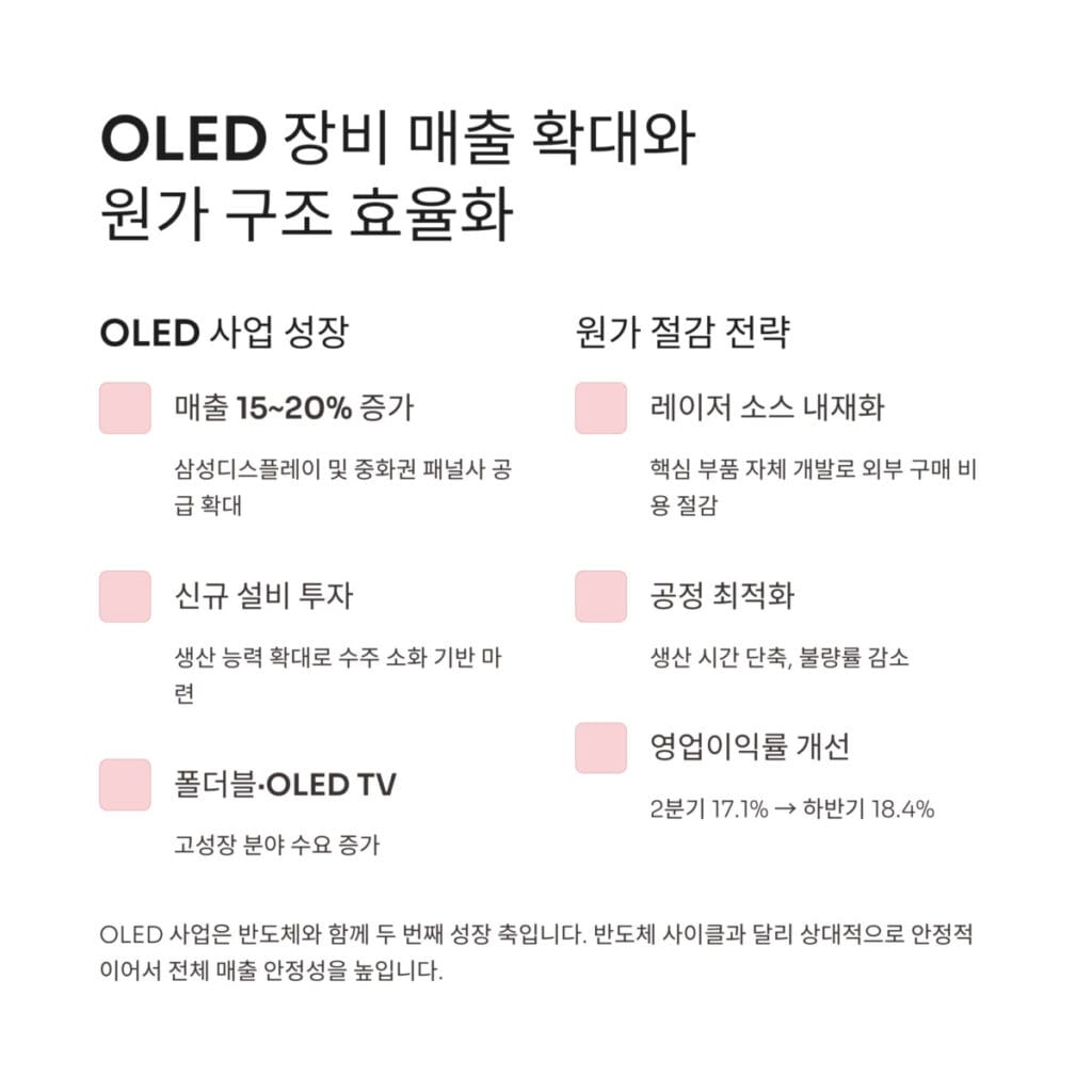 A: 첫째, 반도체 후공정용 레이저 장비 수주 확대로 삼성전자 HBM, DRAM 1c 라인 등에 공급하고 있습니다. 둘째, OLED 장비 매출이 전년 대비 15~20% 증가하며 사업 다각화가 진행됩니다. 셋째, 레이저 소스 내재화와 공정 최적화로 영업이익률이 하반기 18.4%까지 개선되었습니다. 넷째, 신규 레이저 커팅 장비가 추가 매출원을 창출하고 있습니다.