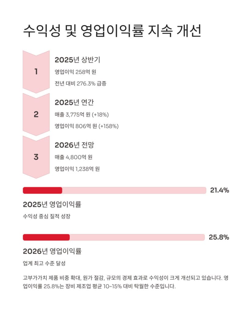 레이저 소스 내재화율 제고와 공정 최적화로 영업이익률이 2분기 17.1%에서 하반기 18.4%로 개선되었습니다. 2025년 연간 예상 영업이익률 21.4%, 2026년 25.8%는 업계 최고 수준의 수익성을 보여줍니다.