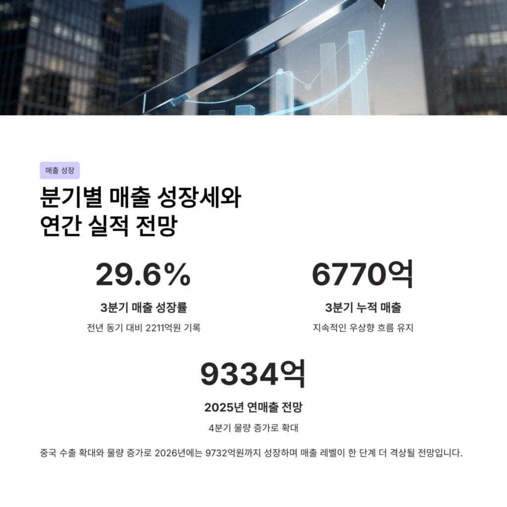 4분기 물량 증가와 중국 수출 확대로 연매출은 9334억원을 기록할 전망이며 2026년에는 9732억원까지 확대되어 매출 레벨이 한 단계 더 격상될 것으로 보입니다.