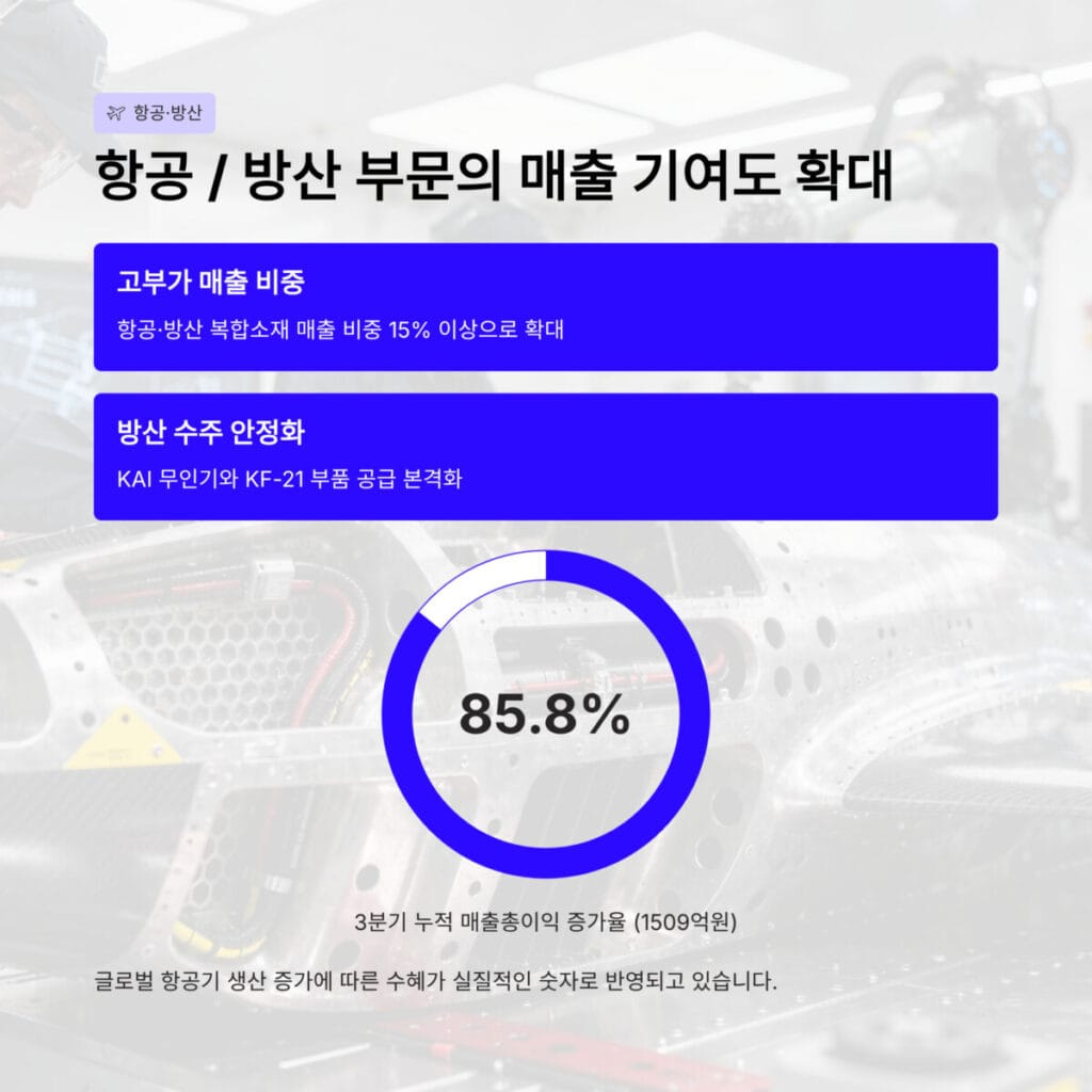 2025년 3분기 누적 매출총이익은 1509억원으로 전년 대비 85.8퍼센트 폭증했으며 이는 글로벌 항공기 생산 증가에 따른 수혜가 실질적인 숫자로 반영된 결과입니다.