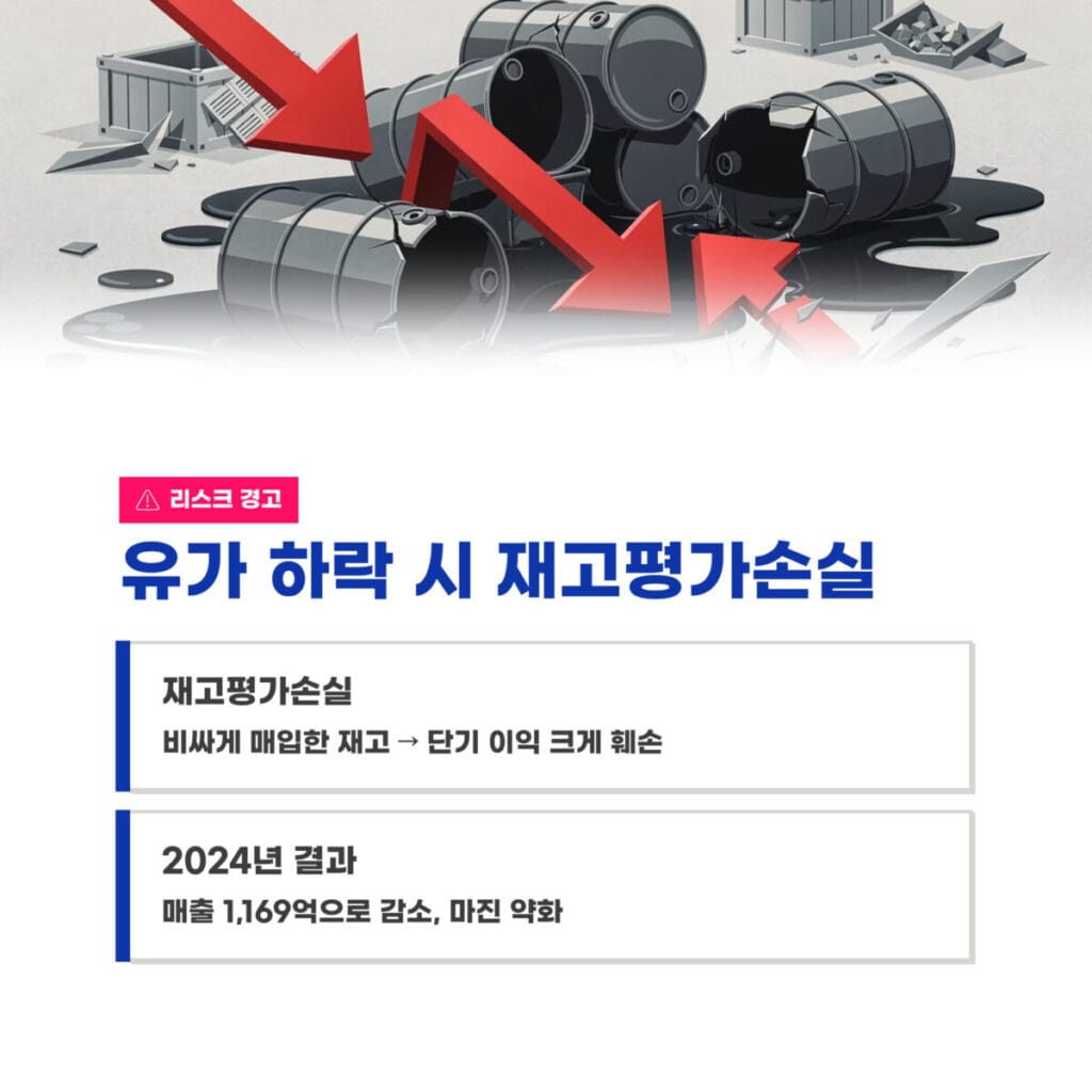 2024년 매출이 1169억 원으로 줄어들며 마진이 약화된 배경에는 이러한 유가 변동에 따른 재고 관리의 어려움이 실적에 반영된 결과입니다. 변동성이 실적의 가장 큰 적입니다.