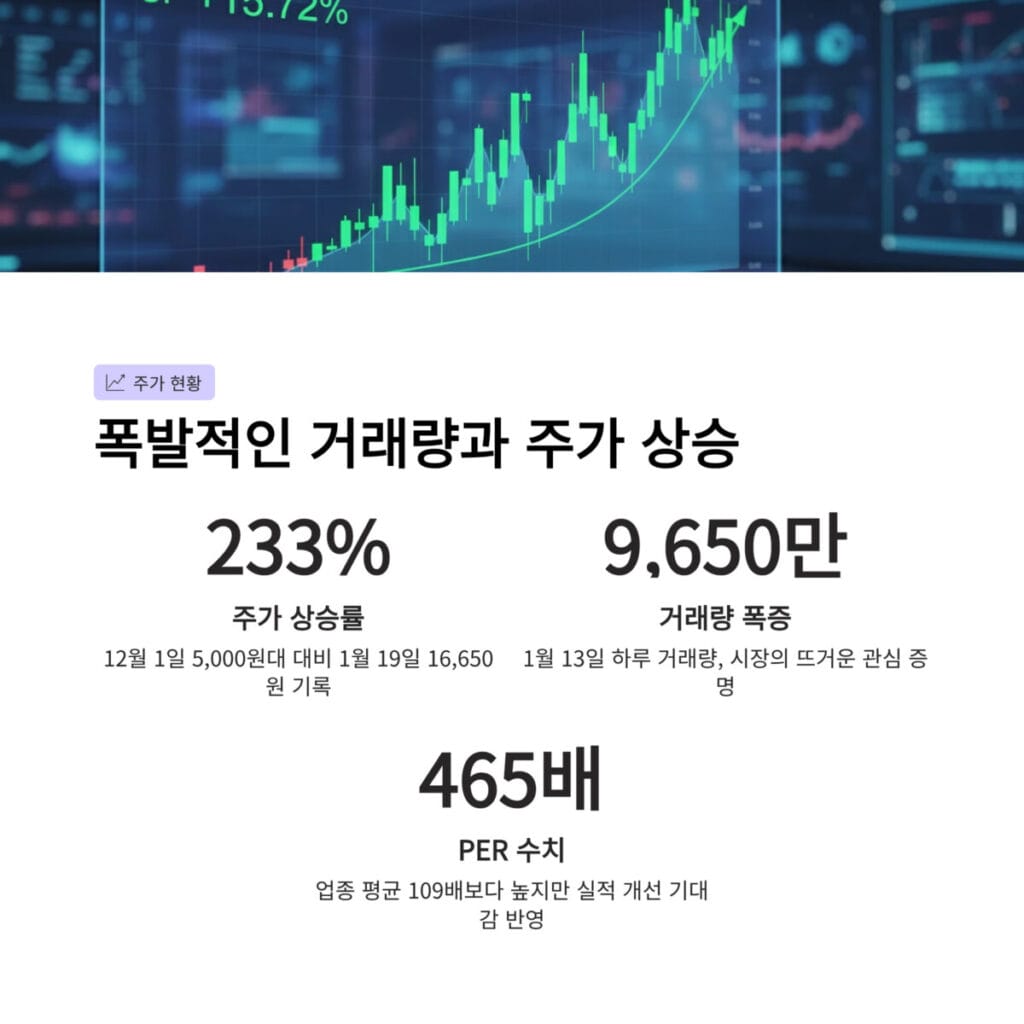 특히 1월 13일에는 하루 거래량이 9650만 주를 기록하며 시장의 뜨거운 관심을 증명했습니다. 현재 피이알 수치는 465배로 업종 평균인 109배보다 높지만 실적 개선 기대감이 주가를 견인하고 있습니다.