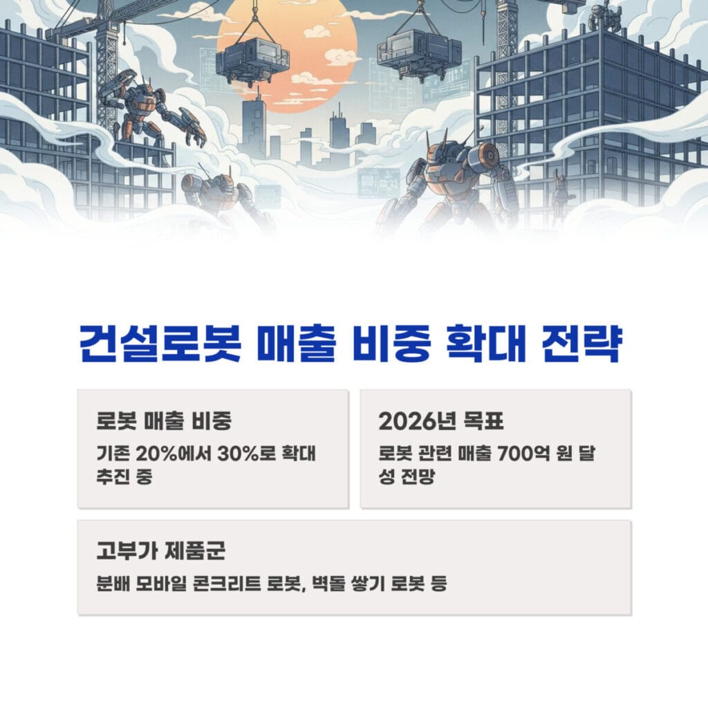 건설로봇 매출 비중의 확대는 전진건설로봇 실적 분석 핵심 변화 중 하나입니다. 기존 20퍼센트 수준이었던 로봇 매출 비중을 30퍼센트까지 끌어올리는 전략을 추진 중이며 2026년 로봇 관련 매출은 700억 원에 달할 전망입니다.