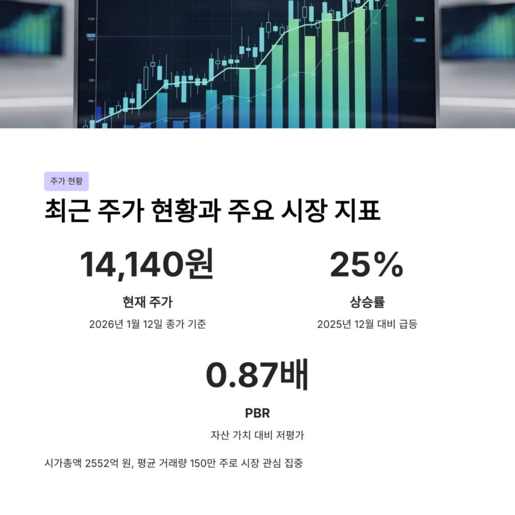 시가총액은 약 2552억 원이며 피비알 0.87배로 자산 가치 대비 안정적인 저평가 상태를 유지하고 있습니다. 거래량은 평균 150만 주 수준으로 시장의 관심이 집중되는 추세입니다.