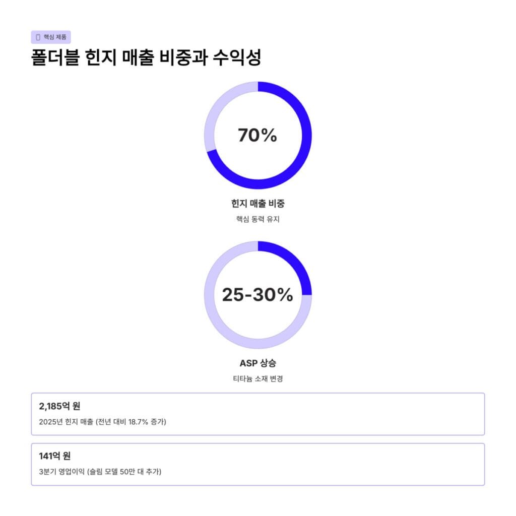 티타늄 케이스 등 소재 변경으로 인해 평균 판매 단가인 에이에스피가 25퍼센트에서 30퍼센트 상승한 점이 주효했습니다. 슬림 모델 출하 증가로 폴드 물량이 50만 대 추가되면서 3분기 영업이익이 141억 원까지 치솟는 성과를 거두었습니다.