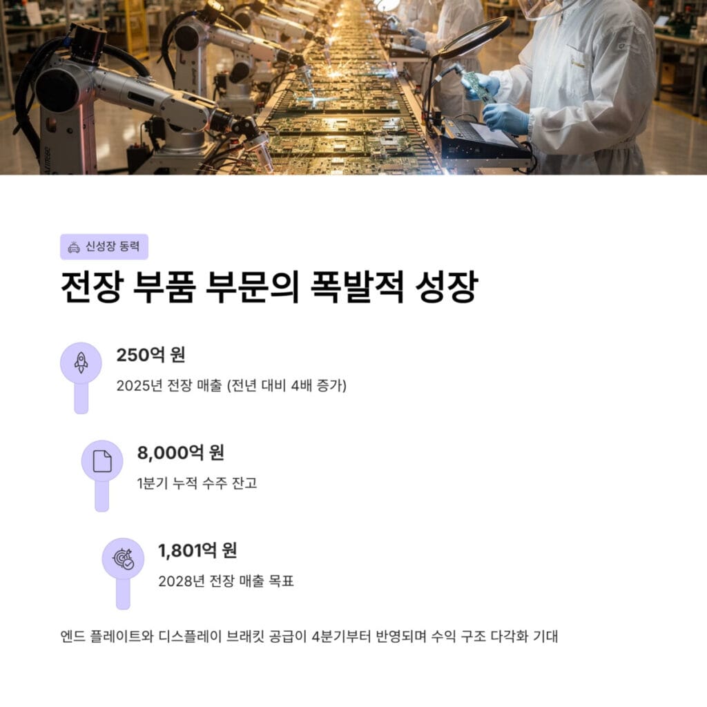 1분기 누적 수주 잔고가 8000억 원에 달하는 엔드 플레이트와 디스플레이 브래킷 공급이 4분기부터 본격 반영되었습니다. 2028년에는 전장 매출이 최대 1801억 원까지 성장할 것으로 기대되어 수익 구조 다각화가 기대됩니다.