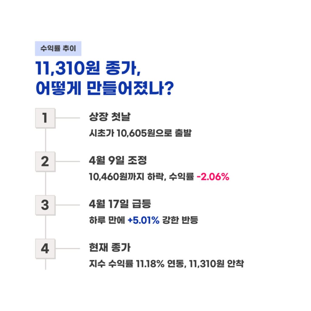 4월 9일에는 10,460원까지 일시적인 조정을 받으며 수익률 -2.06%를 기록하기도 했으나 4월 17일 하루에만 5.01% 급등하며 강한 반등세를 보여주었습니다. 이는 지수 수익률인 11.18%와 연동되어 초기 투자자들에게 긍정적인 성과를 안겨주고 있습니다.