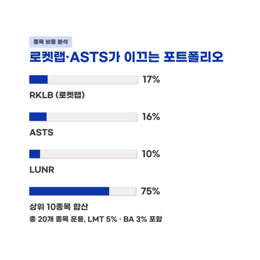 LUNR 10% 및 KTOS 6%에서 7% 그리고 LMT 5% 및 BA 3% 등의 배치는 성장성과 안정성을 동시에 확보하며 총 20개 종목으로 운용됩니다.