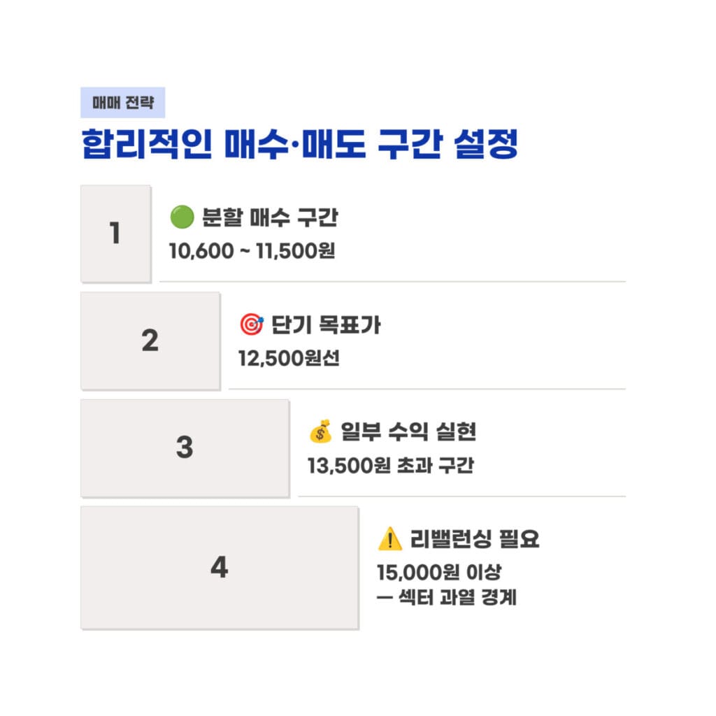 현재 가격 11,310원 기준 매매 전략을 수립해 봅니다. 10,600원에서 11,500원 구간은 장기 투자를 위한 분할 매수 적기로 판단됩니다. 단기적인 목표가로는 12,500원선이 적당하며 13,500원을 넘어서는 구간에서는 일부 수익 실현을 권장합니다.