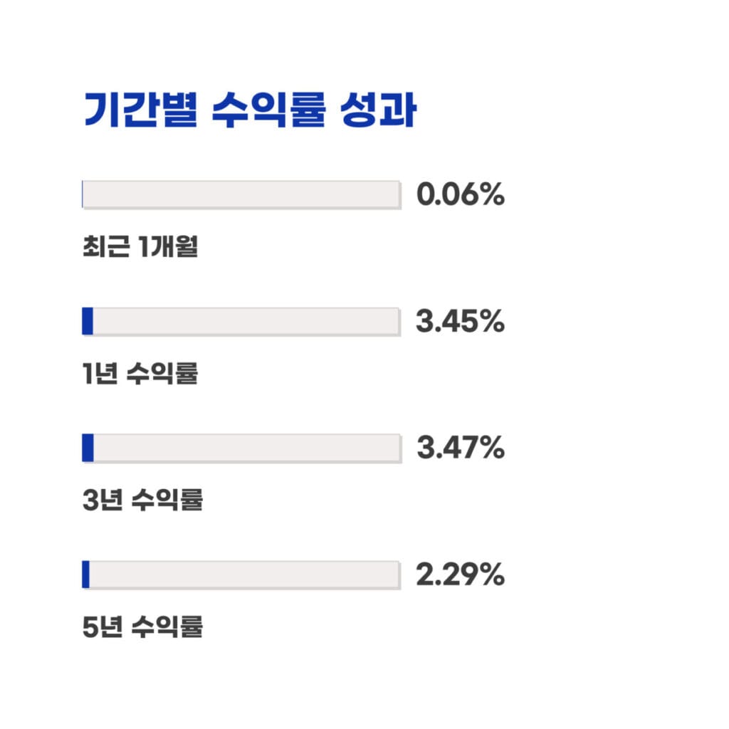 수익률 지표를 보면 최근 1개월은 0.06% 수준이지만 1년 수익률은 3.45%에 달합니다. 장기 성과인 3년 수익률은 3.47%이며 5년 수익률도 2.29%를 기록하며 꾸준한 성과를 내고 있습니다.