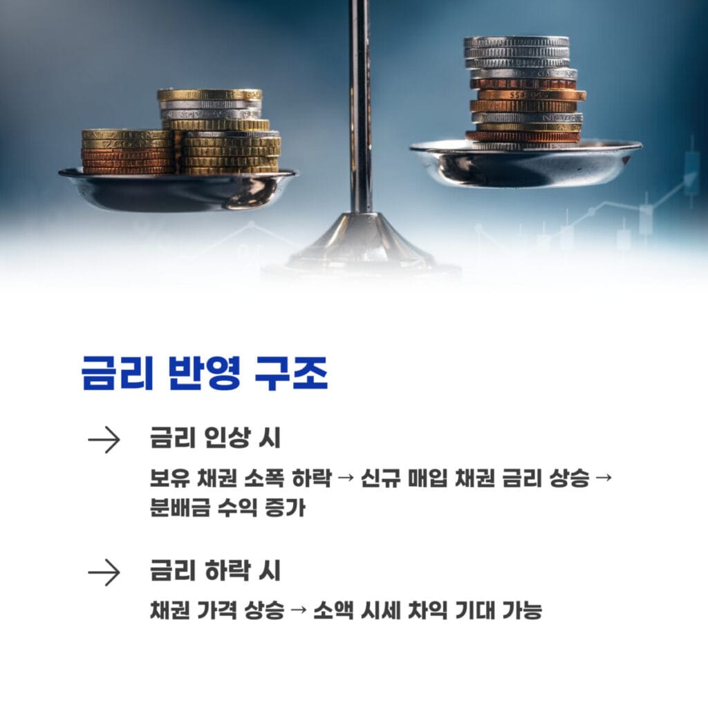 금리 정책 변화에 따른 반영 구조도 독특합니다. 금리가 인상되는 시기에는 보유 채권 가격이 소폭 하락할 수 있으나 새로 매입하는 채권의 금리가 높아져 분배금 수익이 커지는 효과가 있습니다.