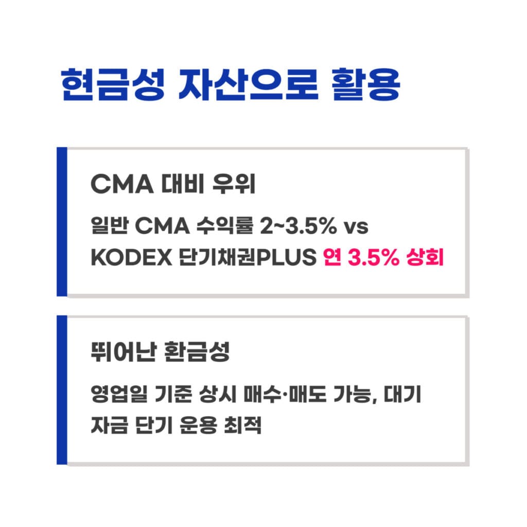 많은 투자자가 이 상품을 파킹통장이나 CMA 대용으로 활용하고 있습니다. 일반적인 증권사 CMA 수익률이 2%에서 3.5% 수준인 것에 비해 KODEX 단기채권PLUS 실적 분석 수익률은 연 3.5%를 상회하여 더 높은 이자 수익을 기대할 수 있습니다.