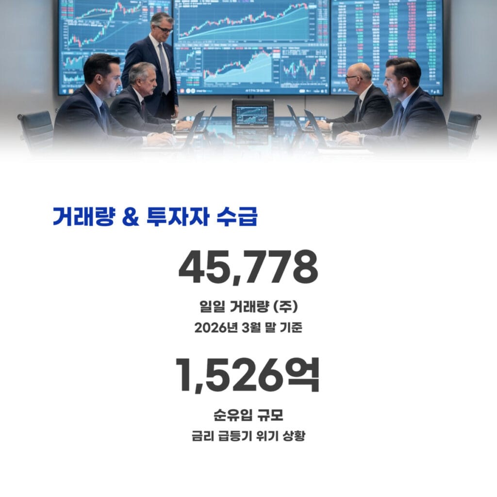 거래량 측면에서도 꾸준한 수요를 확인할 수 있습니다. 2026년 3월 말 기준 일일 거래량은 45,778주 수준으로 폭발적이지는 않으나 기관과 개인의 현금 대체 수요가 끊임없이 유입되고 있습니다.