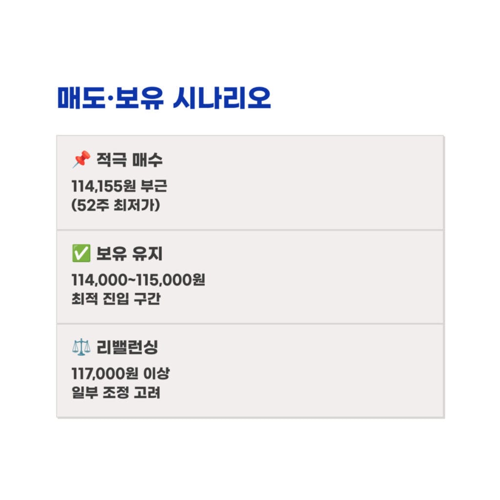 현재 114,650원 구간에서는 보유 전략이 합리적입니다. 52주 최저가인 114,155원 부근에서는 적극적인 매수 전략이 유효하며 가격이 117,000원 이상으로 상승할 경우에는 일부 리밸런싱을 고려할 수 있습니다.