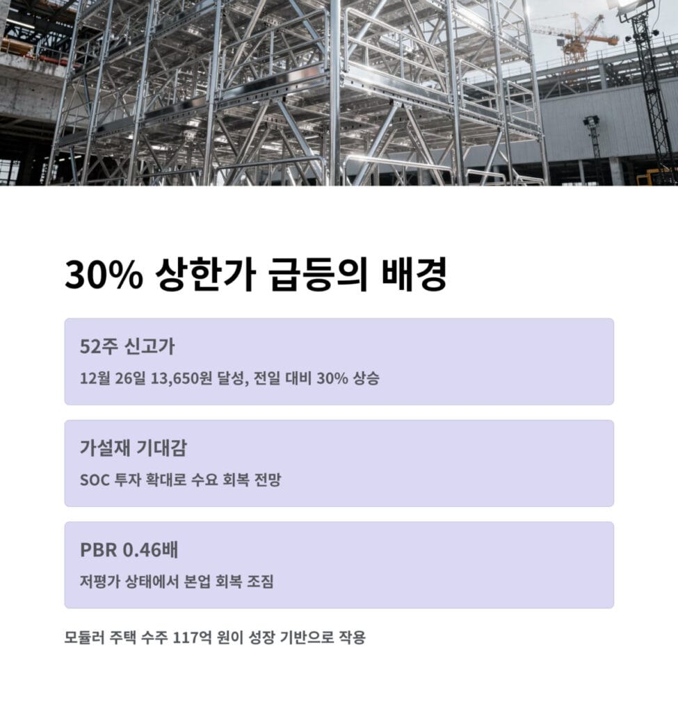 개인 순매수세가 주도했지만 외국인 순매도 289주가 지속됐어요. 12월 25일 주가 30% 상승은 SOC 투자 확대에 따른 가설재 수요 회복 기대를 반영했습니다. 모듈러 주택 수주 117억 원이 매출 성장 기반으로 작용했어요.