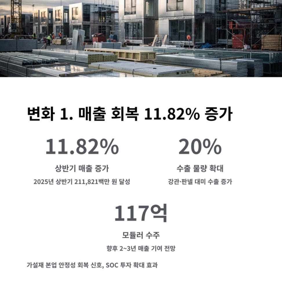 2025년 12월 기준 모듈러 주택 수주 117억 원이 매출 성장 기반이에요. 12월 25일 주가 30% 상승은 SOC 투자 확대에 따른 가설재 수요 회복 기대를 반영했습니다. 강관 대미 수출 물량 20% 확대는 매출 다변화 측면에서 긍정적이에요.