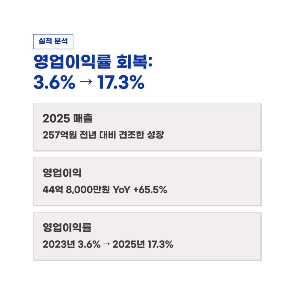 실적 데이터를 살펴보면 2025년 매출은 약 257억원이며 영업이익은 44억 8,000만원을 기록했습니다. 전년 대비 영업이익이 65.5% 성장하며 2023년의 저점을 완전히 탈피했습니다. 핵심 수치는 영업이익률이 2023년 3.6%에서 2025년 17.3%로 대폭 개선되었다는 사실입니다.