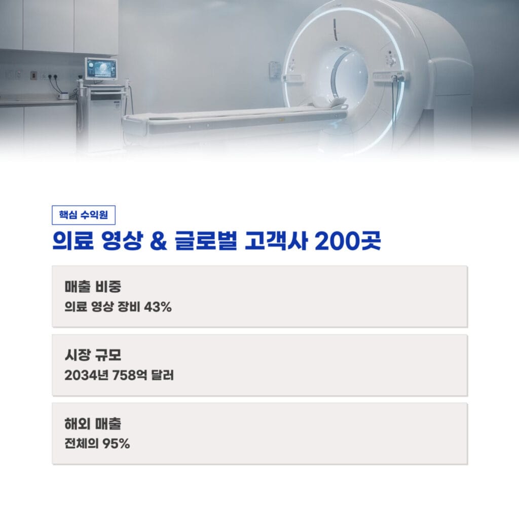 의료 영상 장비 분야는 매출의 43%를 차지하는 핵심 수익원입니다. 글로벌 의료 영상 시장은 2034년까지 758억 달러 규모로 성장할 것으로 예상됩니다. 옵티시스는 GE Healthcare 및 Siemens 등 글로벌 선진 기업 200여 곳을 고객사로 확보하고 있으며 해외 매출 비중이 95%에 달합니다.