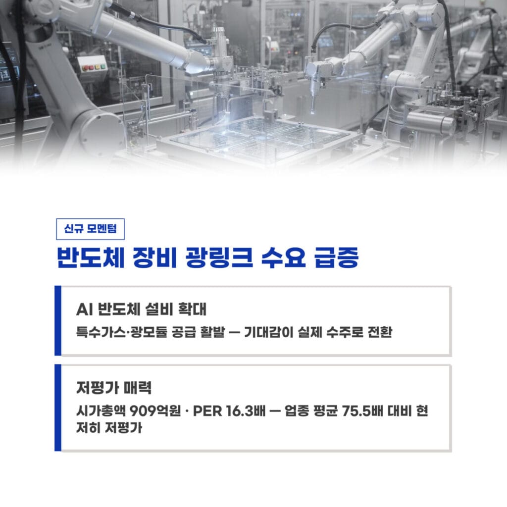 최근 반도체 장비 내부의 영상 및 제어 신호 전송을 위한 광링크 수요가 급증하고 있습니다. 중요한 포인트는 AI 반도체 생산 설비가 늘어남에 따라 옵티시스의 특수가스 및 광모듈 공급이 활발해지고 있다는 점입니다.