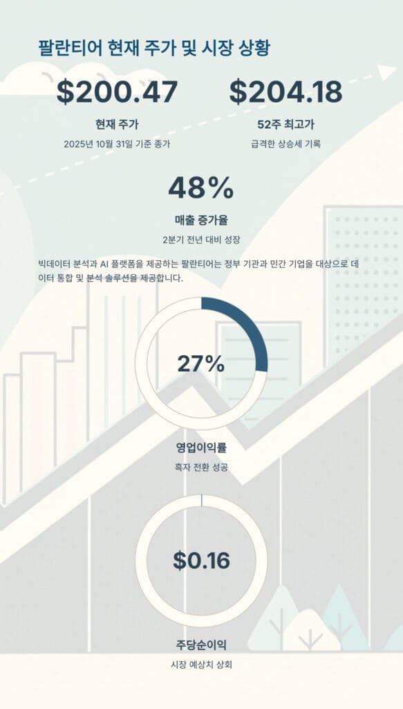 팔란티어 실적 분석을 통해 확인한 결과, AI 플랫폼 상용화가 실적 개선의 핵심 동력으로 작용하고 있습니다. 10월 31일 기준 주가는 200.47달러를 기록했으며, 지난 1년간 급격한 상승세를 보이며 최고 204.18달러까지 근접했습니다.