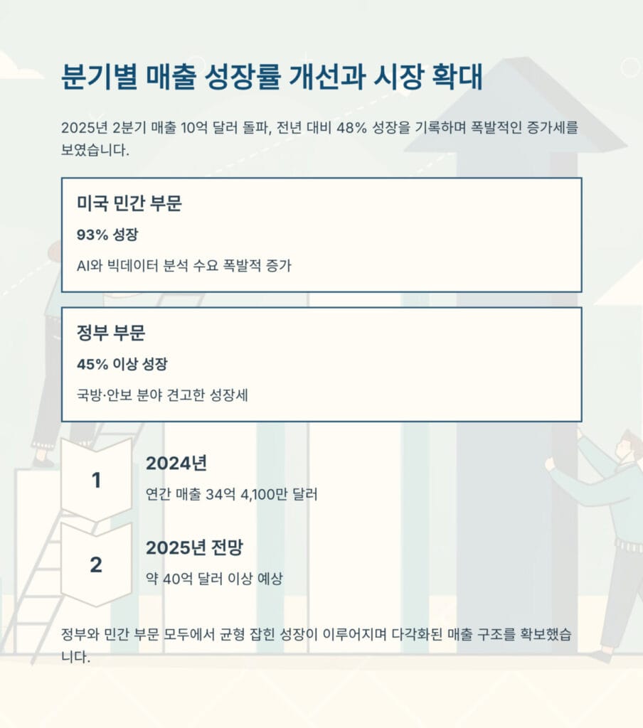 부문별로 살펴보면 더욱 놀랍습니다. 미국 민간 부문은 93% 성장을 기록하며 폭발적인 증가세를 보였습니다. 정부 부문도 45% 이상의 견고한 성장을 유지하며 매출 기반이 크게 확대되었습니다.