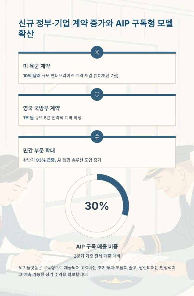 팔란티어의 성장을 이끄는 두 가지 핵심 동력은 신규 정부·기업 계약 증가와 AIP 구독형 모델 확산입니다. 2025년 7월 미 육군과 10억 달러 규모의 엔터프라이즈 계약을 체결했으며, 영국 국방부와도 1조 원 규모의 5년 전략적 계약을 확정했습니다.