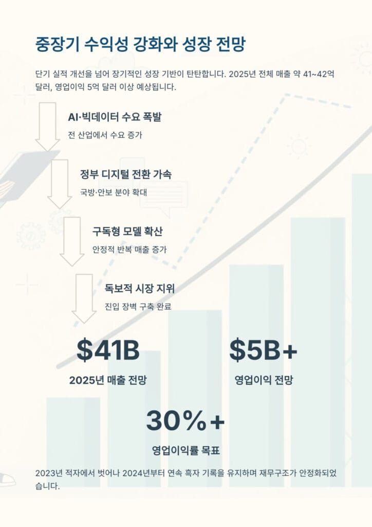 팔란티어 실적 분석의 미래를 가늠하는 핵심은 중장기 수익성 강화 전망입니다. 팔란티어 실적 분석을 통해 확인할 수 있는 것은 단기 실적 개선을 넘어 장기적인 성장 기반이 탄탄하다는 점입니다.
