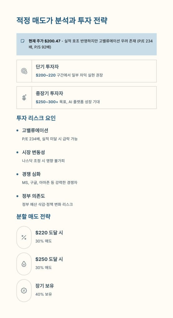 10월 31일 주가 200.47달러는 실적 개선을 반영하고 있지만 P/E 234배라는 고밸류에이션 우려도 존재합니다. 단기적으로는 200~220달러 구간에서 분할 매도를 통한 수익 실현을 권장하며, 중장기 투자자라면 250~300달러 이상의 목표가를 고려하면서 AI 플랫폼 상용화 성과를 지켜보는 것이 바람직합니다.