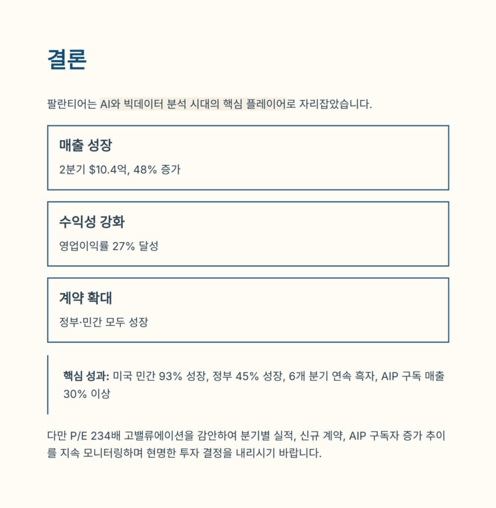 팔란티어 실적 분석 결과를 종합하면, 펀더멘털은 견고하지만 밸류에이션은 이미 높은 기대를 반영하고 있습니다. 추가 상승을 기대한다면 분기별 실적 발표와 신규 계약 체결 여부를 지속적으로 모니터링해야 합니다.