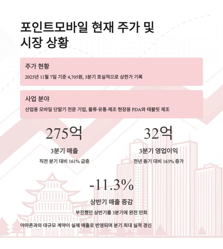 포인트모바일 실적 분석을 통해 확인한 결과, 글로벌 공급 확대와 수익구조 개선이 실적 턴어라운드의 핵심 동력으로 작용하고 있습니다. 11월 7일 기준 주가는 4,705원을 기록했으며, 호실적 발표로 상한가를 기록하며 시장의 폭발적인 반응을 얻었습니다.