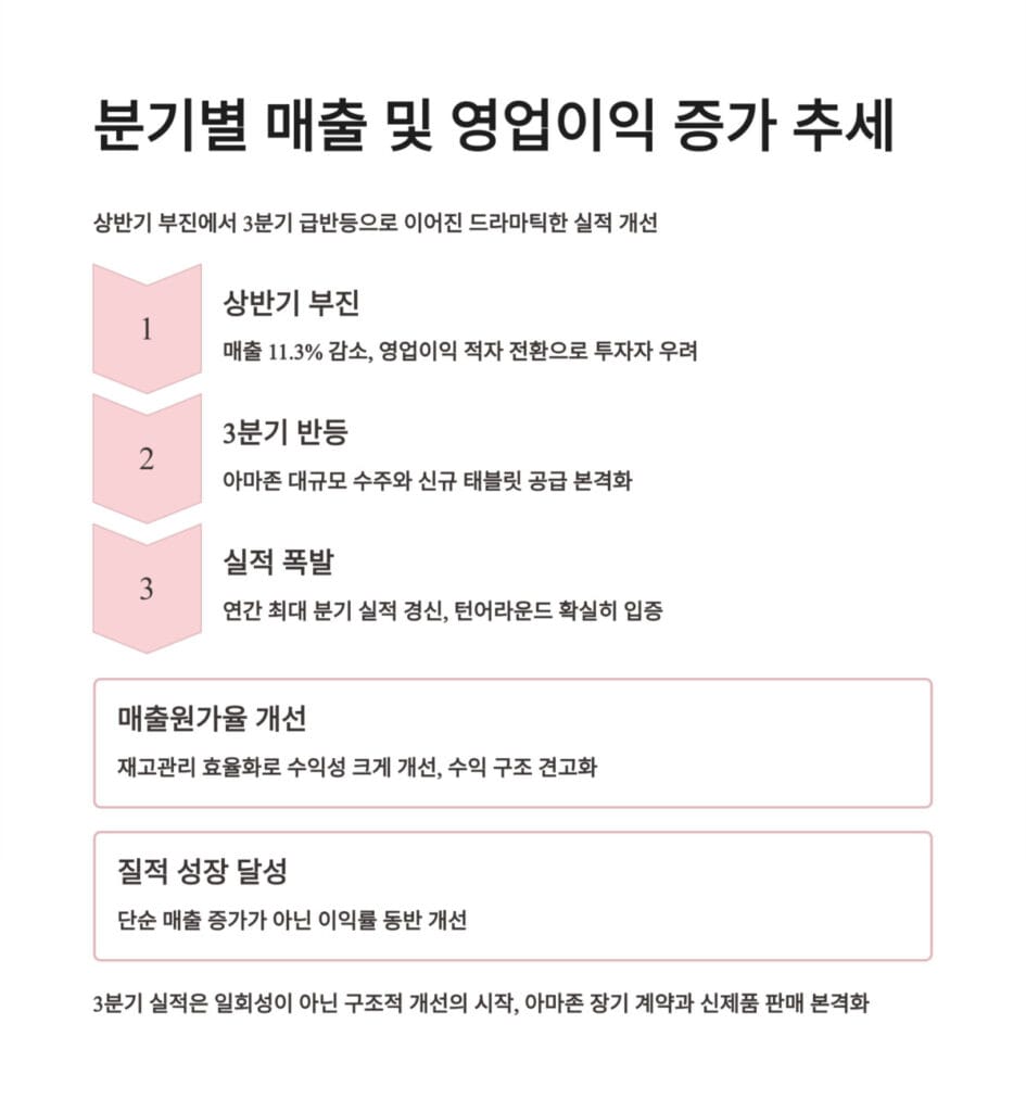 특히 주목할 점은 상반기 부진을 3분기에 완전히 만회했다는 것입니다. 상반기에는 매출이 전년 동기 대비 11.3% 감소하고 영업이익이 적자 전환했지만, 3분기 들어 극적인 반등에 성공했습니다.