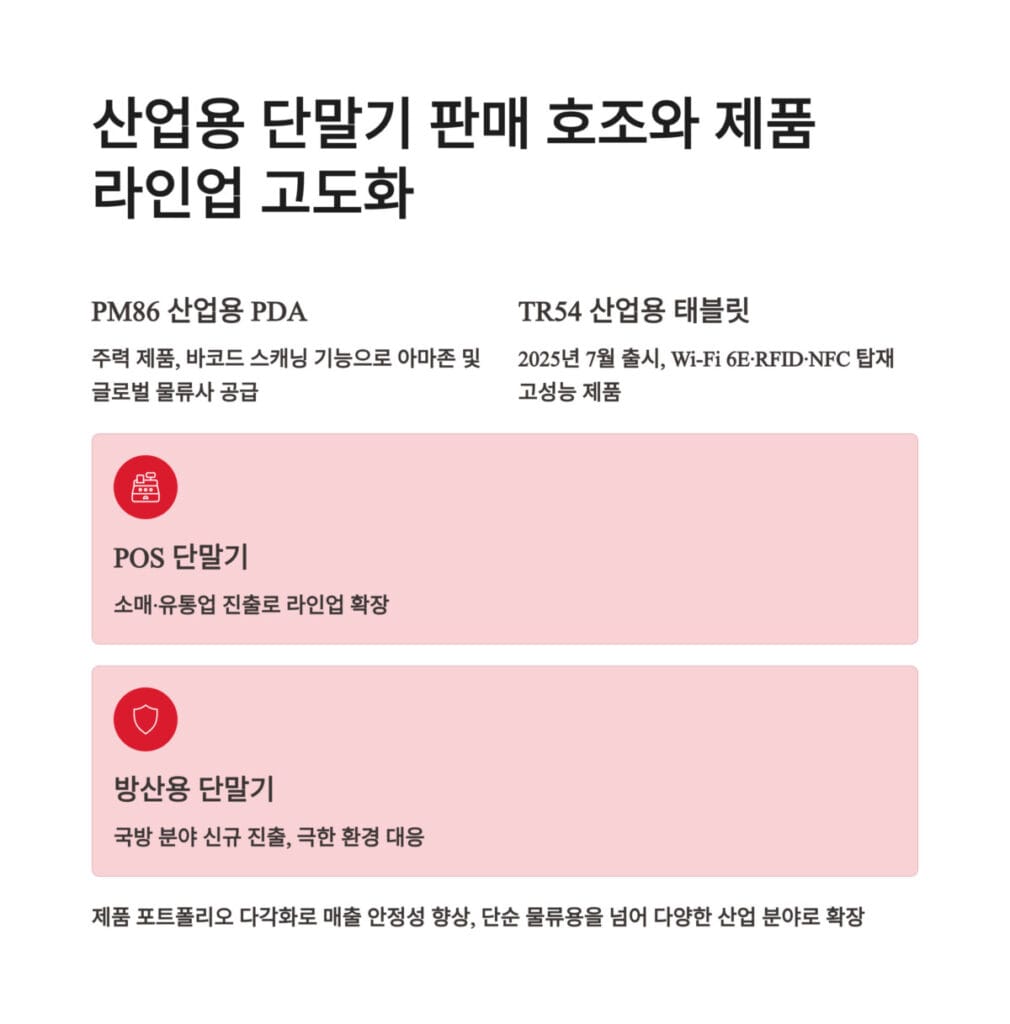 제품 포트폴리오의 다변화는 신규 시장 진출 및 경쟁력 확보에 중요한 역할을 하고 있습니다. POS 및 방산용 단말기까지 라인업이 확장되면서 단순 물류용을 넘어 다양한 산업 분야로 사업 영역을 확대하고 있습니다.