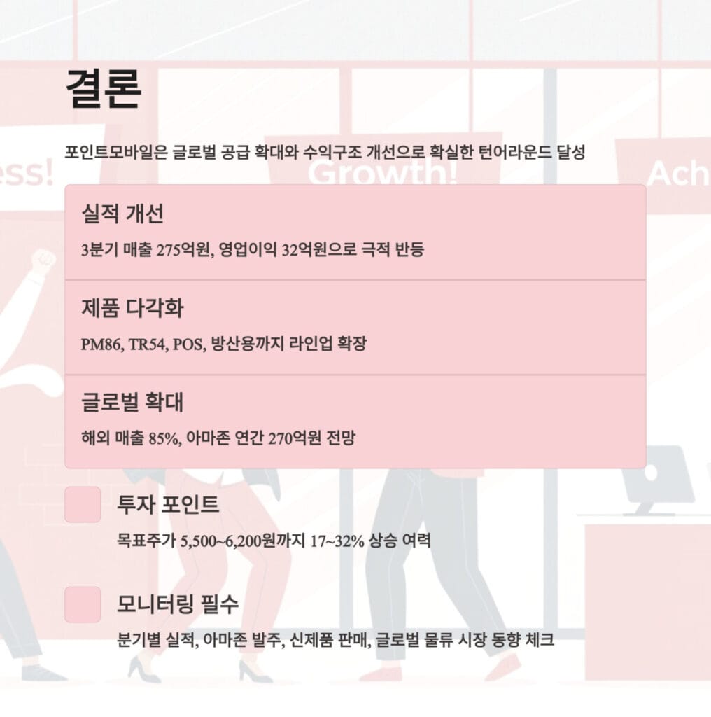 지금까지 포인트모바일 실적 분석을 통해 글로벌 공급 확대와 수익구조 개선으로 인한 세 가지 핵심 변화를 살펴보았습니다. 분기별 매출 및 영업이익 증가 추세, 산업용 단말기 판매 호조와 제품 라인업 고도화, 해외 매출 비중 확대와 수익 구조 개선이 모두 긍정적으로 진행되고 있습니다.