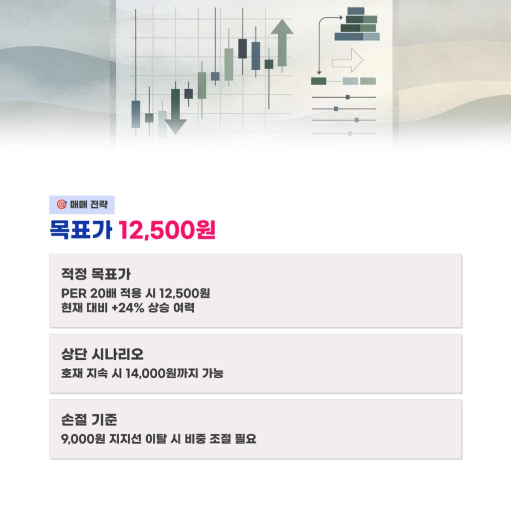 | 목표 주가 산정 금액 | 12500원 주가수익비율 20배 |