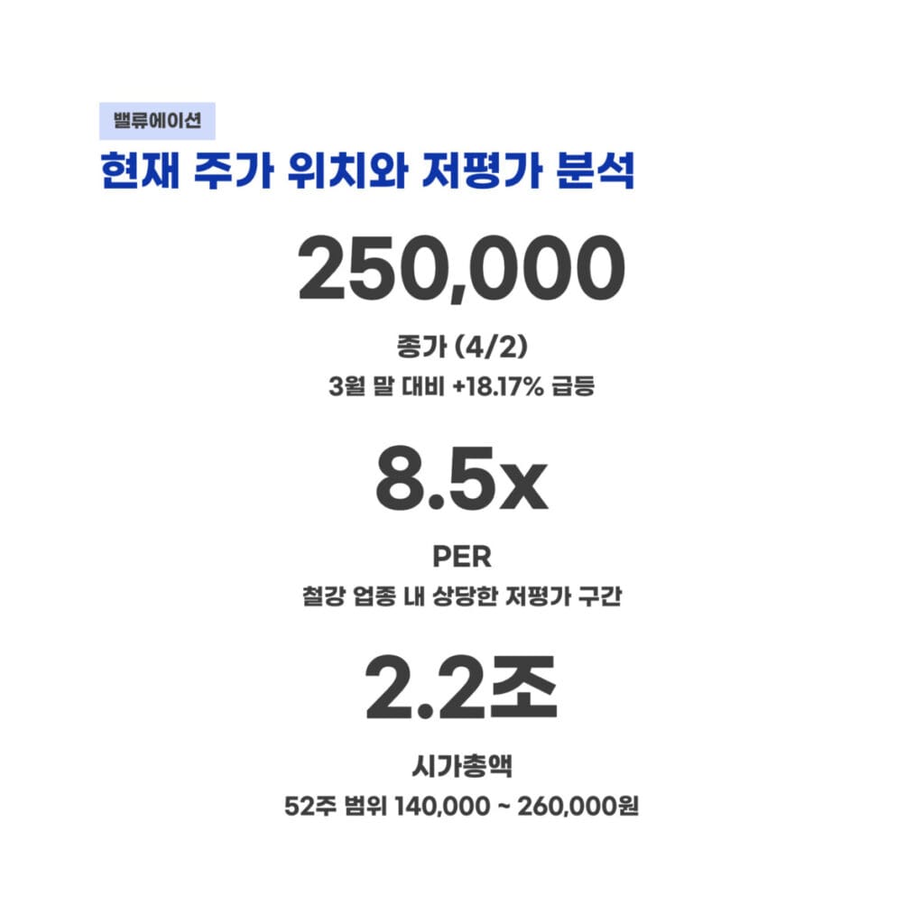 현재 시가총액은 2.2조원 규모이며 PER은 8.5배 수준으로 철강 업종 내에서도 저평가 구간에 머물러 있습니다. 52주 주가 범위인 140,000원에서 260,000원 사이를 고려할 때 전고점 탈환 가능성이 매우 높은 시점입니다.