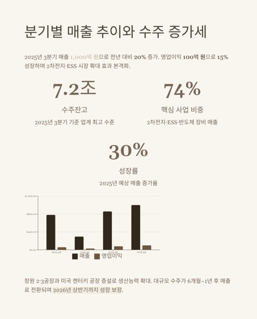 장비 수주 증가세는 더욱 인상적입니다. 2025년 3분기 기준 수주잔고는 7조 2,000억 원으로 업계 최고 수준에 도달했습니다. 이는 향후 2~3년간 안정적인 매출 기반을 확보했다는 의미입니다. 국내외 주요 배터리 제조사와 자동차 업체들이 ESS와 전기차 생산을 확대하면서 장비 수요가 지속적으로 증가하고 있습니다.