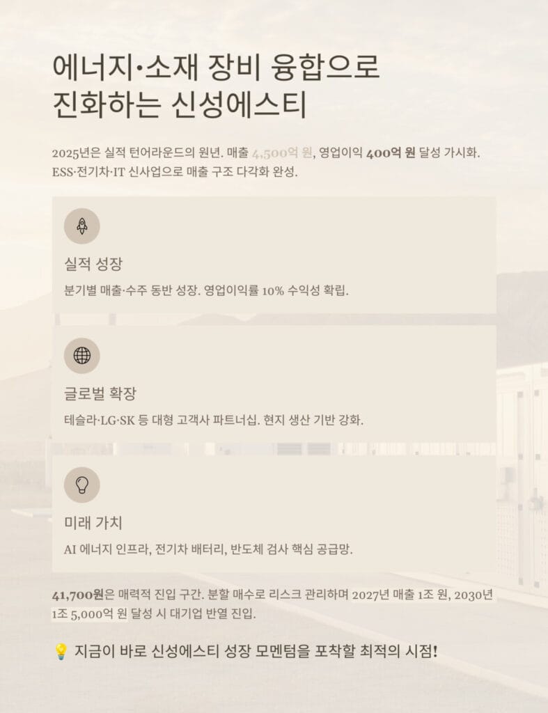 신성에스티 실적 분석을 종합하면, 2025년은 실적 턴어라운드의 원년입니다. 분기별 매출과 수주가 동반 성장하며 매출 4,500억 원, 영업이익 400억 원 달성이 가시화되고 있습니다. ESS·전기차·IT 등 신사업 비중 확대로 매출 구조가 다각화되었고, 영업이익률은 10% 수준으로 개선되며 수익성 중심 성장이 확립되었습니다.
