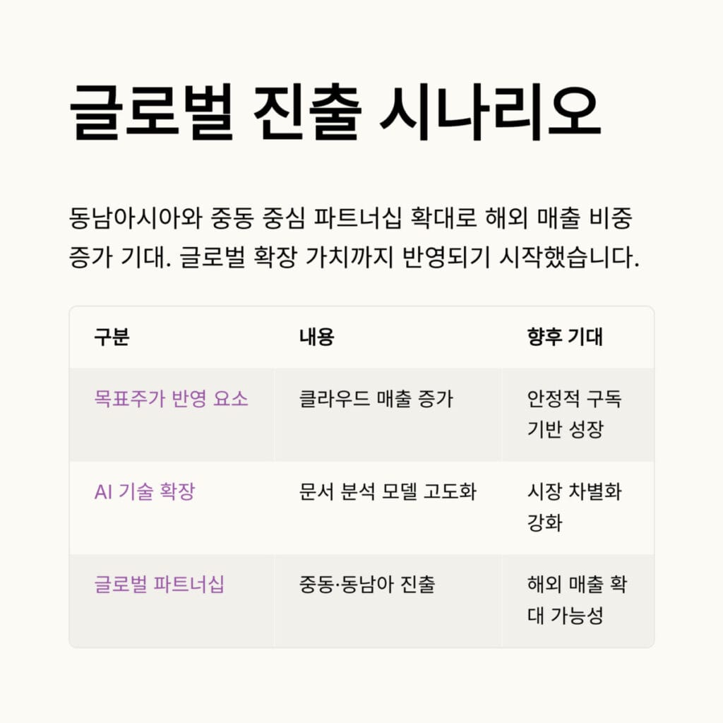 이제 앞으로 무엇을 바라봐야 할지 정리해보면 이해가 더 쉬워집니다. SaaS 매출 증가가 계속 이어질지, 공공과 금융 부문의 신규 도입 사례가 얼마나 늘지, AI 기반 기능의 고도화가 어떤 속도로 전개될지가 핵심 축이 될 것입니다. 이 모든 요소가 실적 안정성과 성장성을 가르는 기준이 되기 때문입니다.