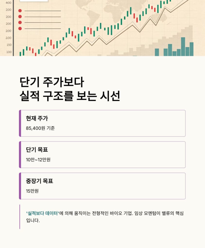 85,400원 기준 높은 밸류처럼 보이지만, 코오롱티슈진 실적 분석 결과를 보면 이 기업은 ‘실적보다 데이터’에 의해 움직이는 전형적인 바이오 회사입니다. 단기 10만~12만원, 중장기 15만원이라는 밸류가 제시되는 이유도 결국 임상 모멘텀에 있죠.