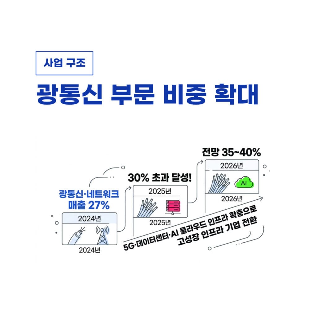 5G와 데이터센터 그리고 AI 클라우드 인프라 확충에 따라 2026년에는 이 비중이 35%에서 40%까지 대폭 확대될 것으로 전망됩니다. 단순 LED 기업에서 고성장 인프라 기업으로 탈바꿈하고 있습니다.