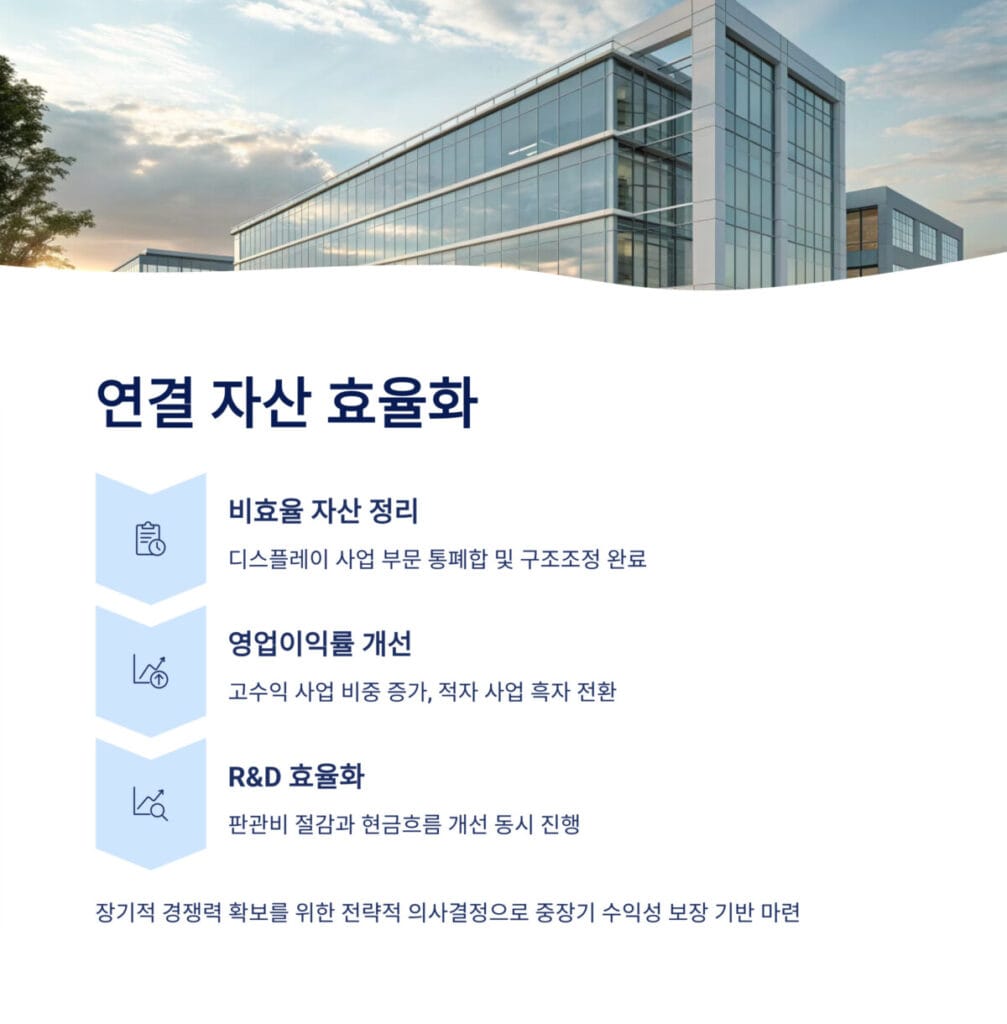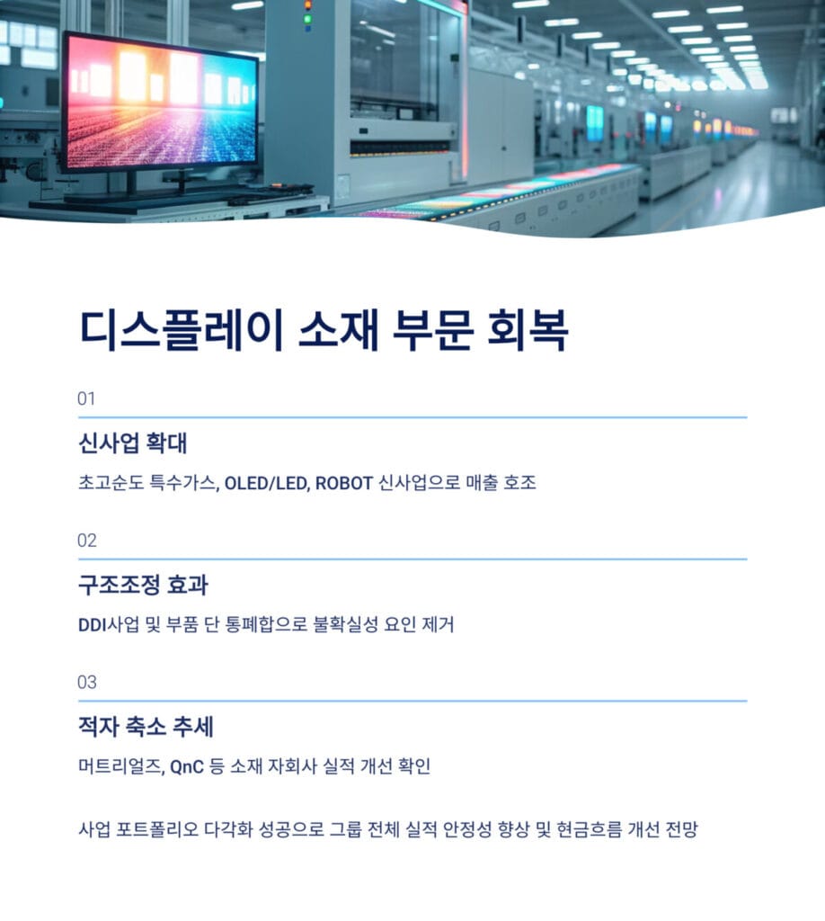 디스플레이 소재 부문 회복의 배경에는 구조조정 효과가 있다. 디스플레이 DDI사업 및 부품 단의 통폐합과 구조조정으로 연결 실적의 불확실성 요인을 제거하면서, 원익홀딩스 실적 분석에서 디스플레이 소재 부문 회복이 자산 효율화로 직접 연결되고 있다.